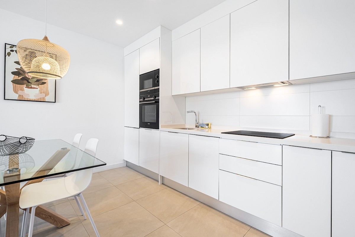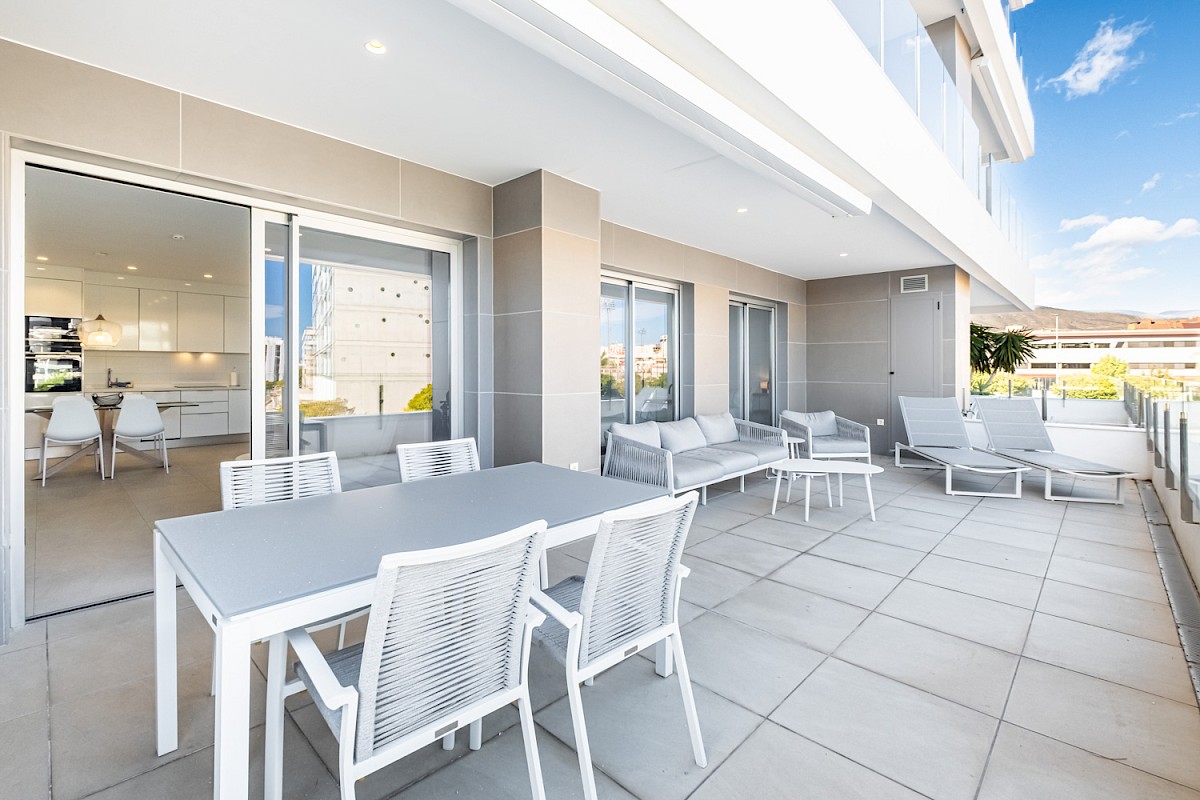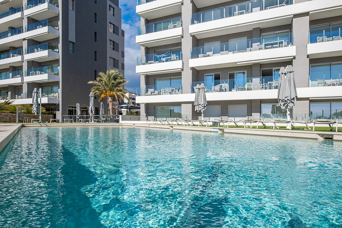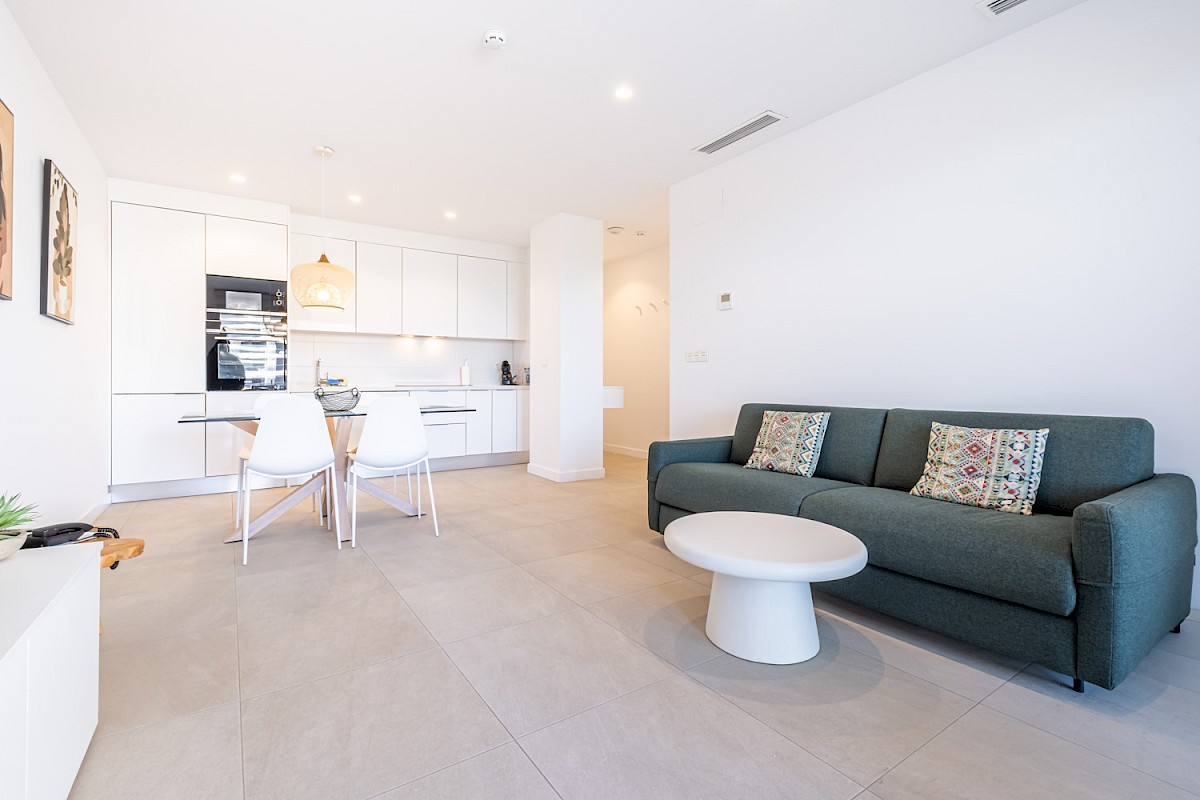 Blue Line B004 ligt op een unieke locatie, slechts 6 meter boven grondniveau en 25 meter boven zeeniveau, wat zorgt voor een oninneembaar uitzicht op de Middellandse Zee. Vanuit zowel de living als beide slaapkamers heb je directe toegang tot het dubbele terras van 35 m², waar je optimaal kunt genieten van de omgeving.